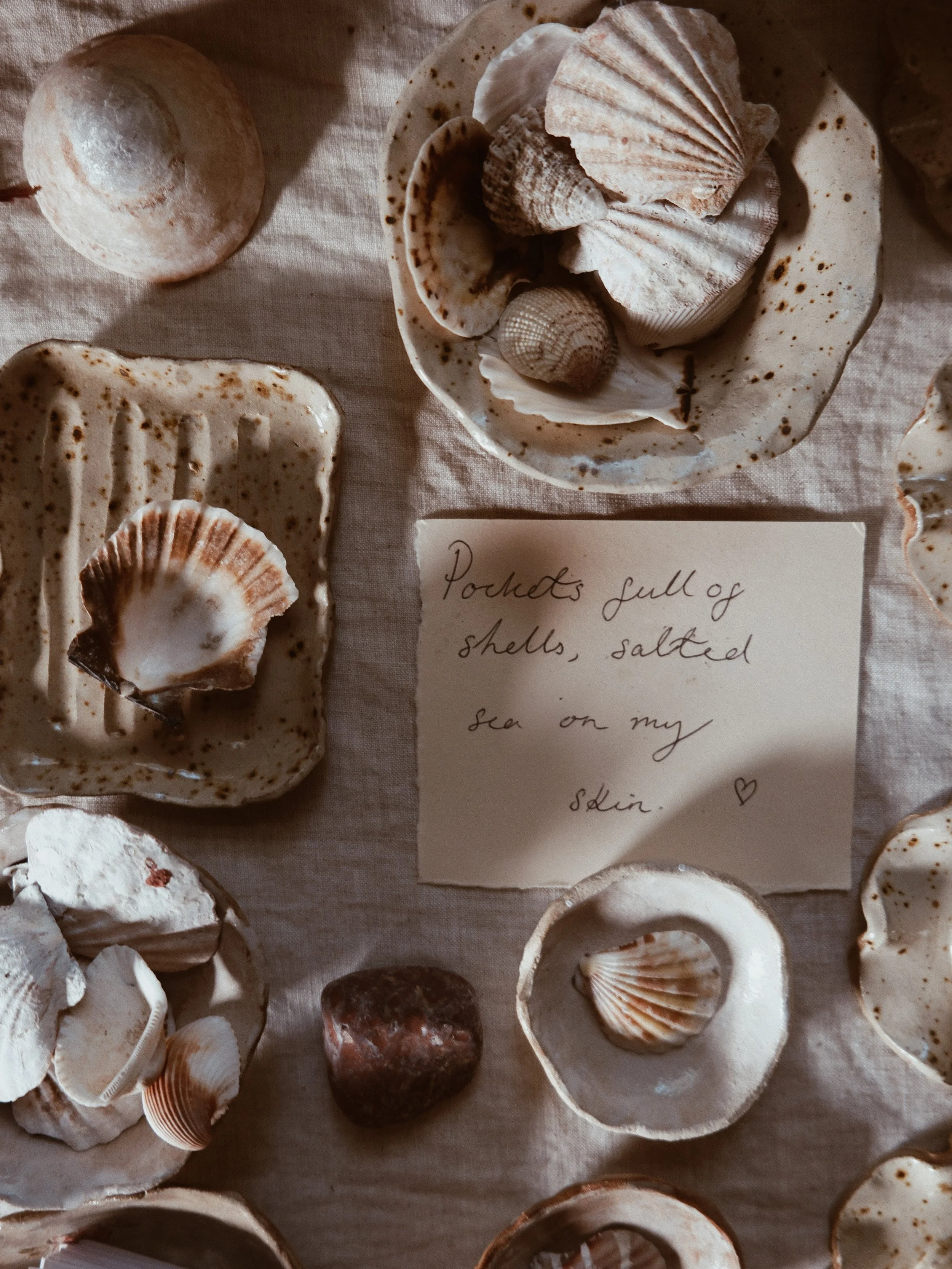 I recently relocated from the wild isle of Tasmania, Australia, to the equally wild and beautiful south Cornish coastline. Two lives oceans apart, but so intrinsically connected by natures palette. In both worlds I have pockets full of shells, and salted sea on my skin.